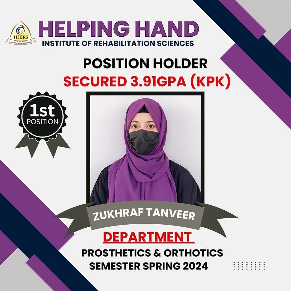 Mansehra – A moment of pride and inspiration for the Helping Hand Institute of Rehabilitation Sciences (HHIRS), as Zukhraf Tanveer, a dedicated and talented student from the Department of Prosthetics and Orthotics, achieves an outstanding milestone. Zukhraf, currently in the 5th semester, secured a remarkable GPA of 3.91 in the final exams, earning first position and setting a new benchmark for academic excellence in Khyber Pakhtunkhwa (KPK).