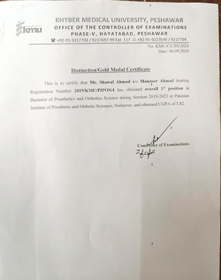 PESHAWAR: Shawal Ahmad, son of Manzoor Ahmad, has been awarded the gold medal for securing the first position in the Bachelor of Prosthetic and Orthotic Sciences program at the Pakistan Institute of Prosthetic and Orthotic Sciences (PIPOS), Peshawar. He achieved this distinction with an impressive CGPA of 3.82 during the academic session 2019-2023, outshining his peers in both academic and clinical excellence.
